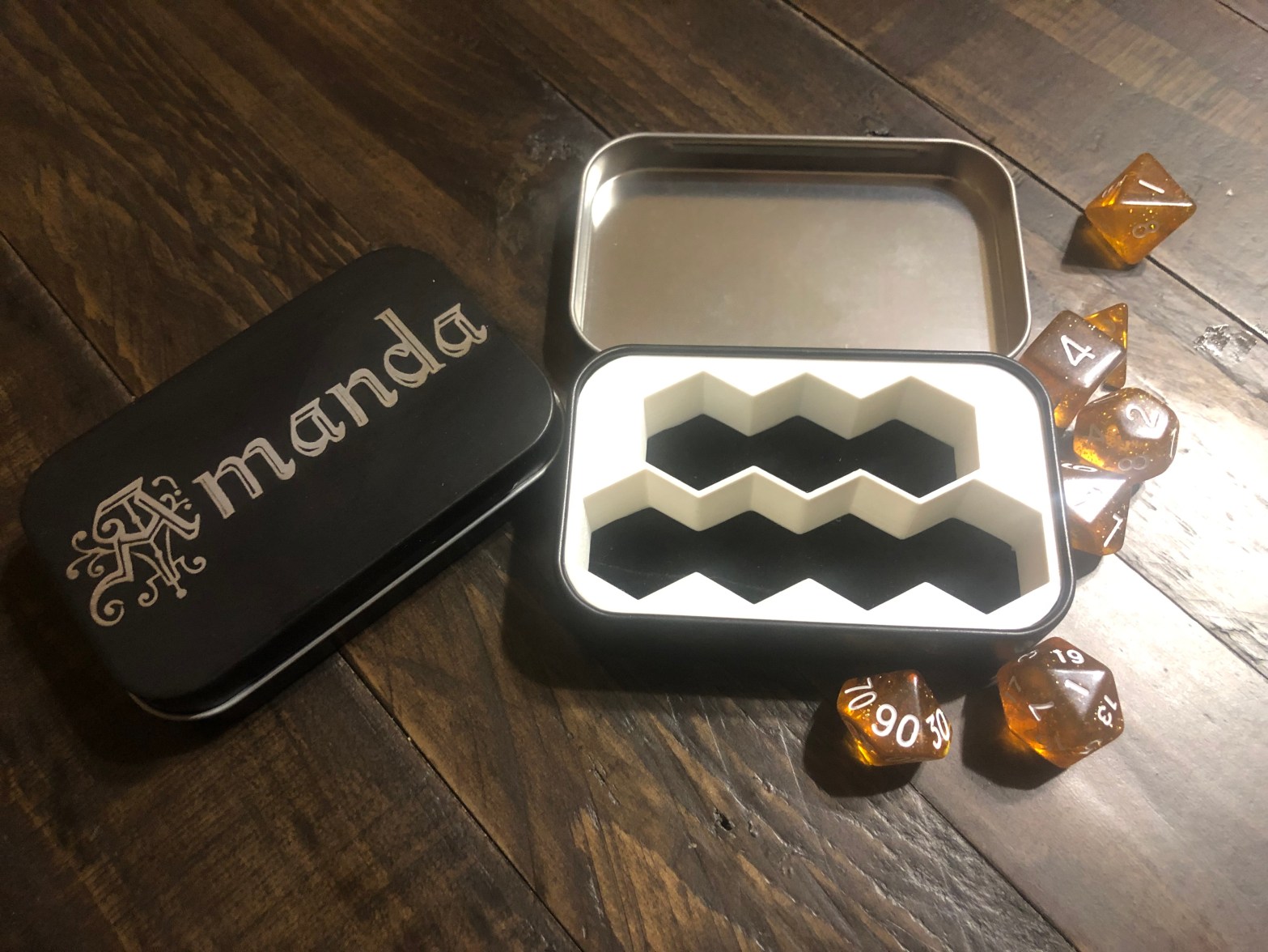 We’ve been adding custom new accessories to personalize and enhance your gaming experiences, but really this is still the beginning! We’ve upgraded our travel tins for dice to be these new slick black cases with assorted colors that can be selected for the inside: